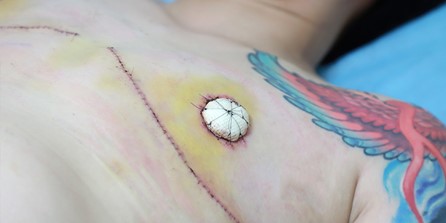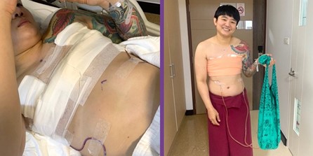 L'infirmière est venue panser la plaie tous les jours et vérifier le tuyau d'évacuation. Plus il y a de saignement, mieux c'est pour la plaie, car cela signifie qu'il n'y a pas de coagulation sanguine causée par la chirurgie. La ligne de drainage sera avec moi pendant environ 3-4 jours, selon que le saignement s'est arrêté ou non. C'est mieux s'il reste plus longtemps. J'ai aussi fait déplacer mes mamelons parce qu'ils étaient auparavant des mamelons masculins.