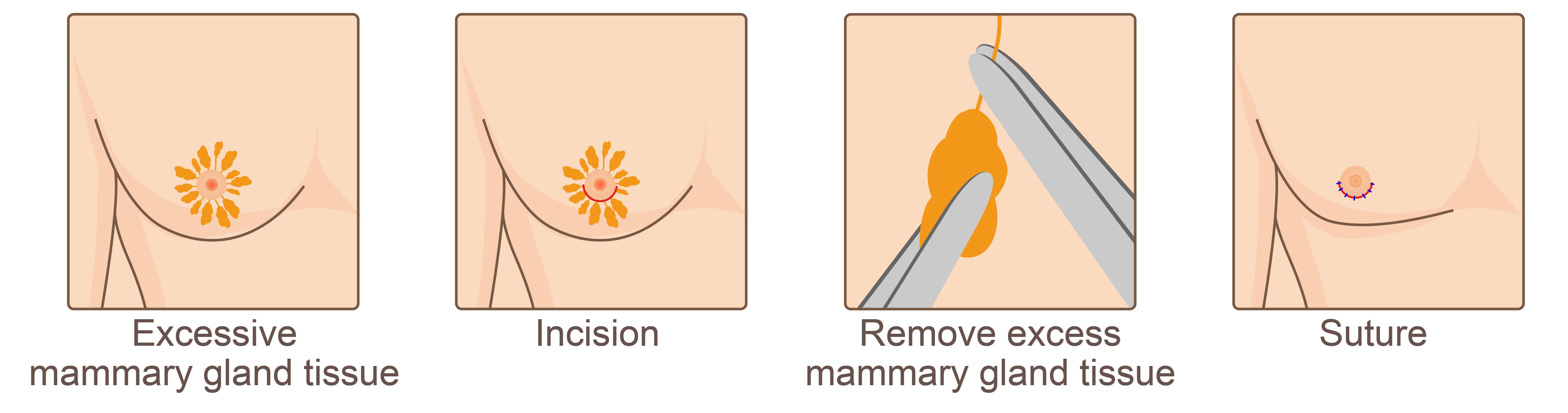 •  คนไข้จะมีแผลเล็กๆ ประมาณ 1/3 ของปานนม ( Periareolar incision) เพื่อตัดเอาเนื้อนมออก การผ่าตัด แบบนี้ จะใช้กับคนที่มีขนาดนมไม่ใหญ่ และ ผิวหนังยังตึงกระชับอยู่