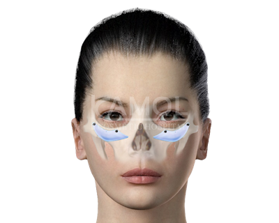 - ศัลยแพทย์จะทำการเปิดแผลในปากบริเวณเหนือริมฝีปาก หรือเปิดแผลใต้ขนตาล่าง และวางซิลิโคนที่ตัดแต่งแล้วบนโหนกแก้มเดิม